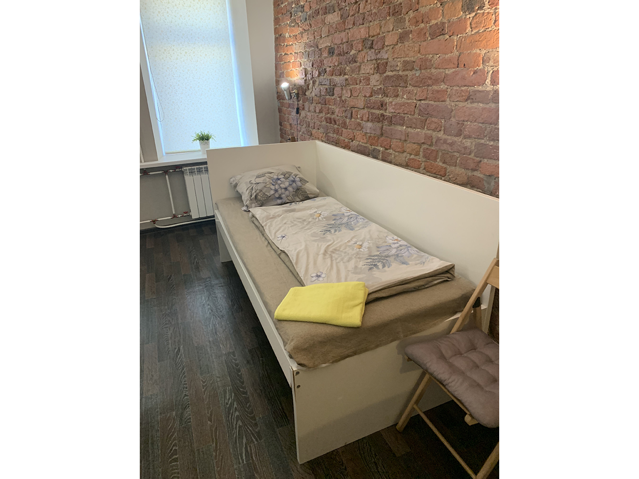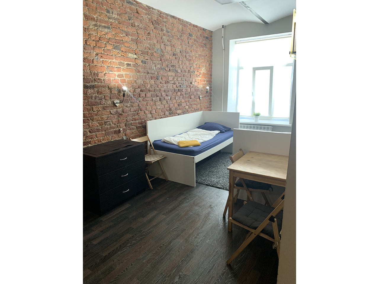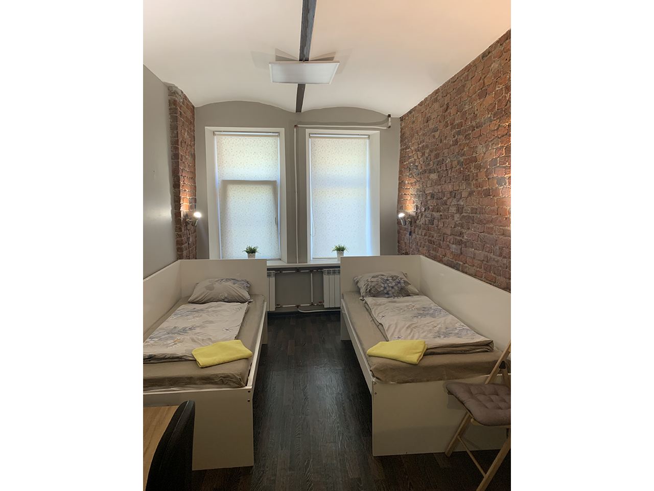 Комната 16 кв м, выполнена в стиле "лофт" с тремя односпальными кроватями 90х200. У кроватей имеются тумбочки и гибкие светильники. Окно на фасад здания.