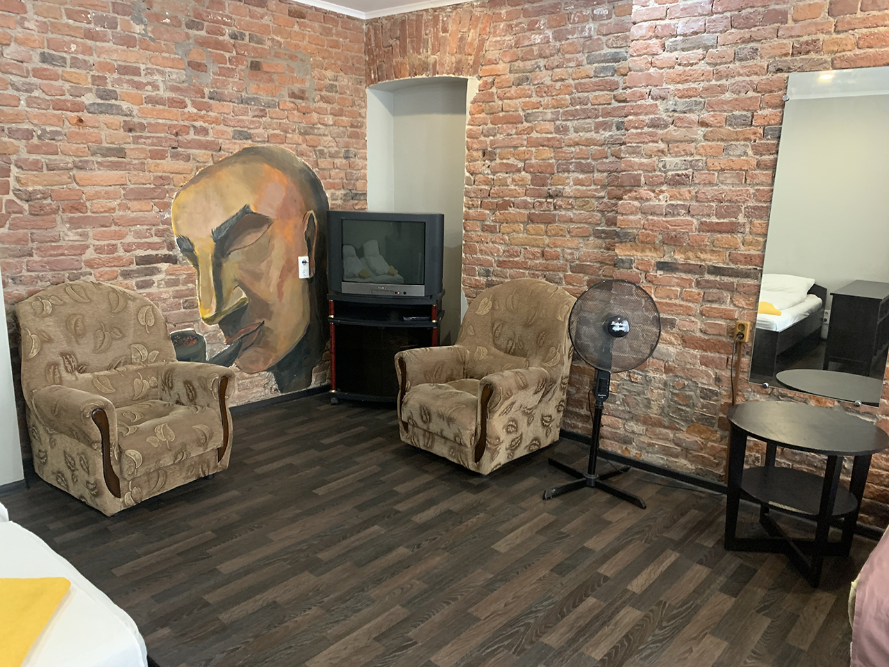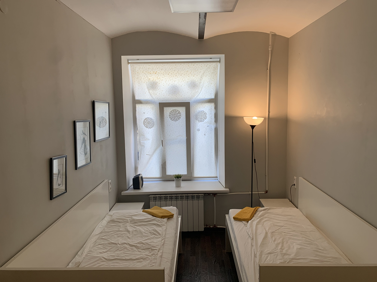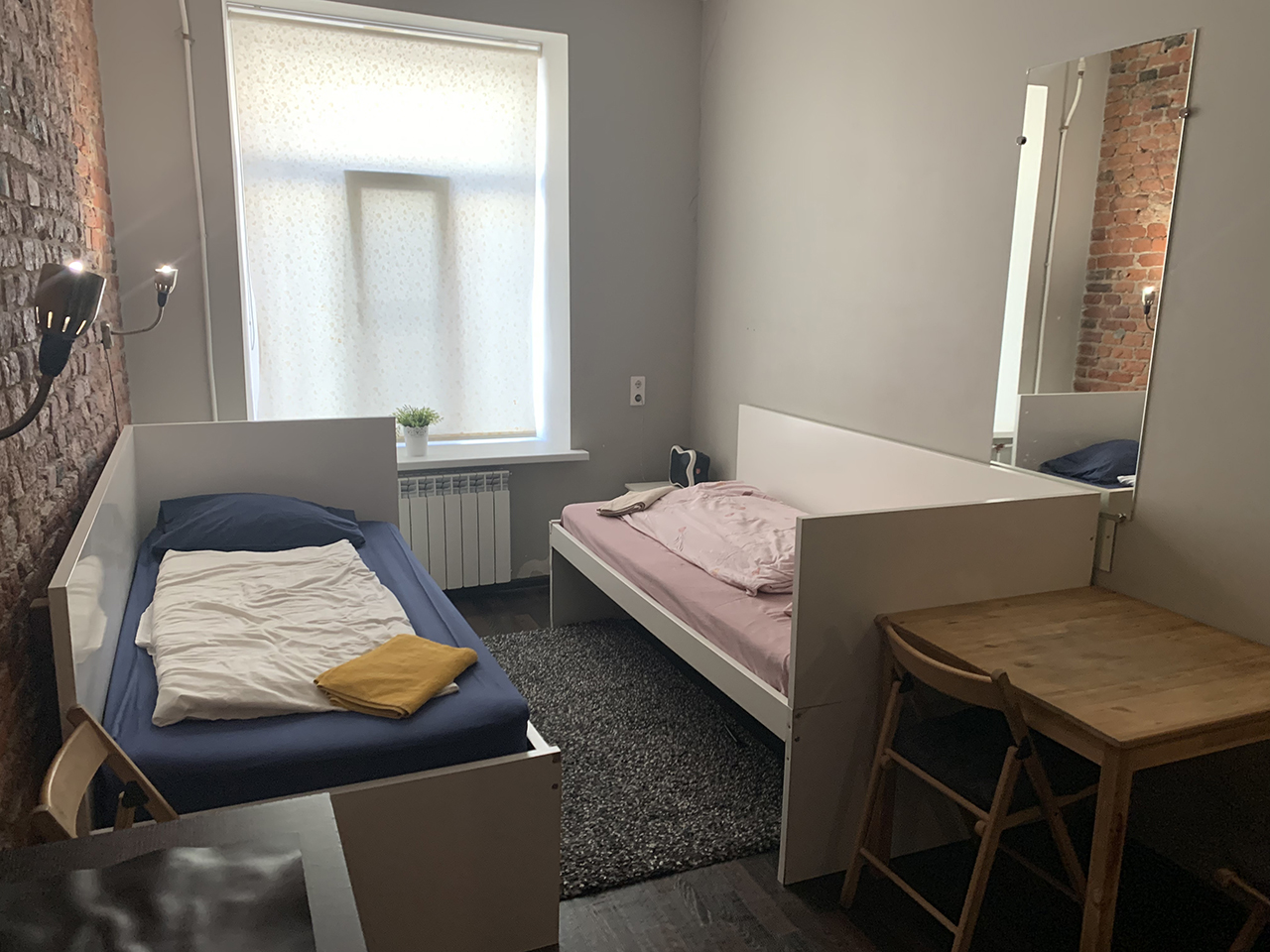 Площадь комнаты 10 кв.м. Окна выходят во двор. В номере две кровати 90х200, стол, стулья и шкафчик для одежды. Рассчитан на двоих гостей.