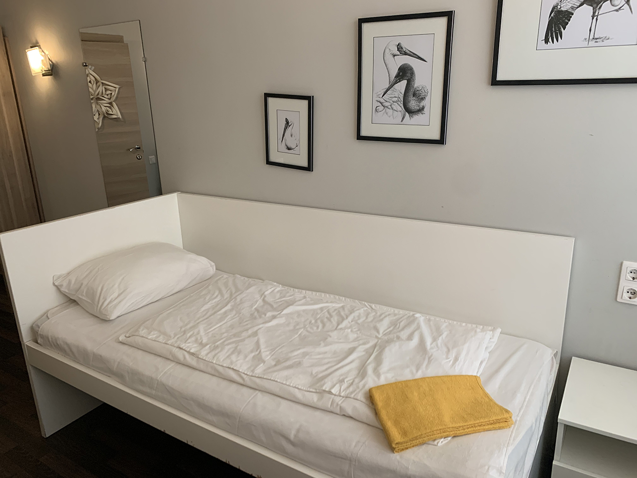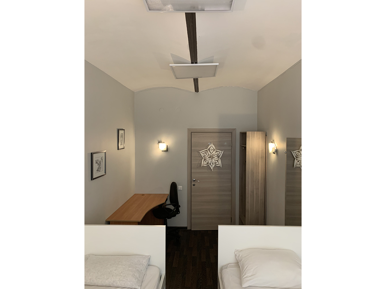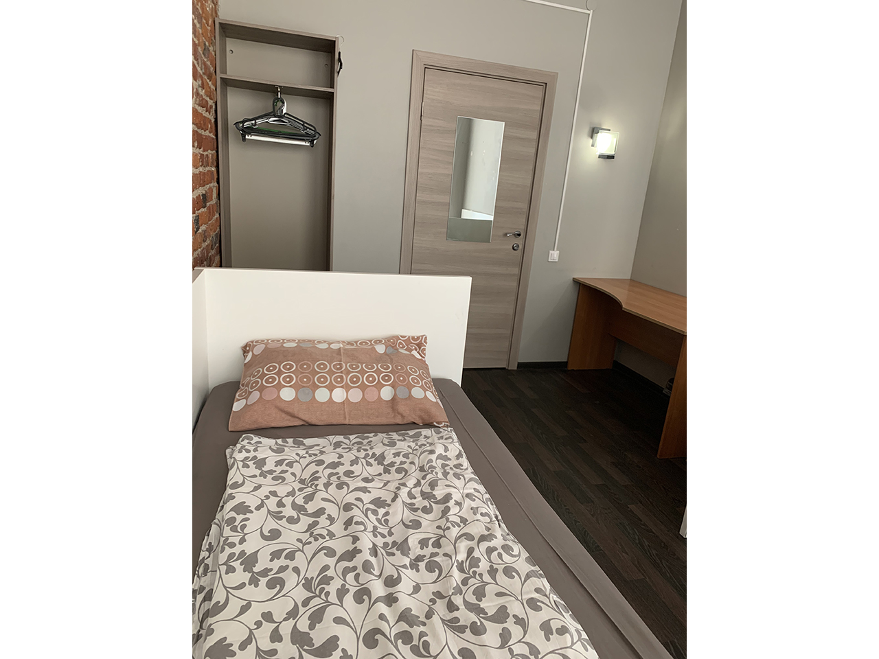 Площадь комнаты 10 кв.м. Окна выходят во двор. В номере две кровати 90х200, стол, стулья и шкафчик для одежды. Рассчитан на двоих гостей.