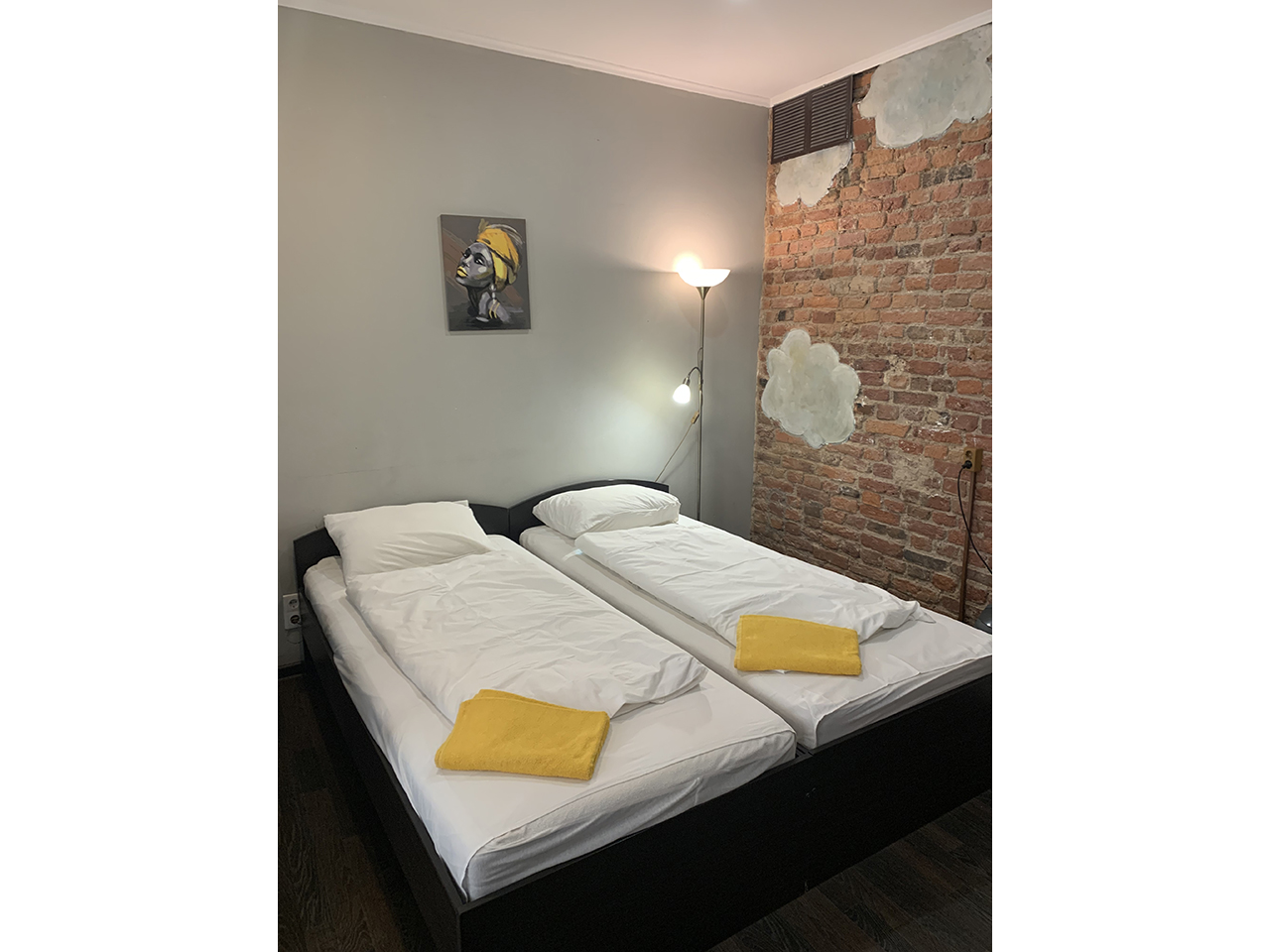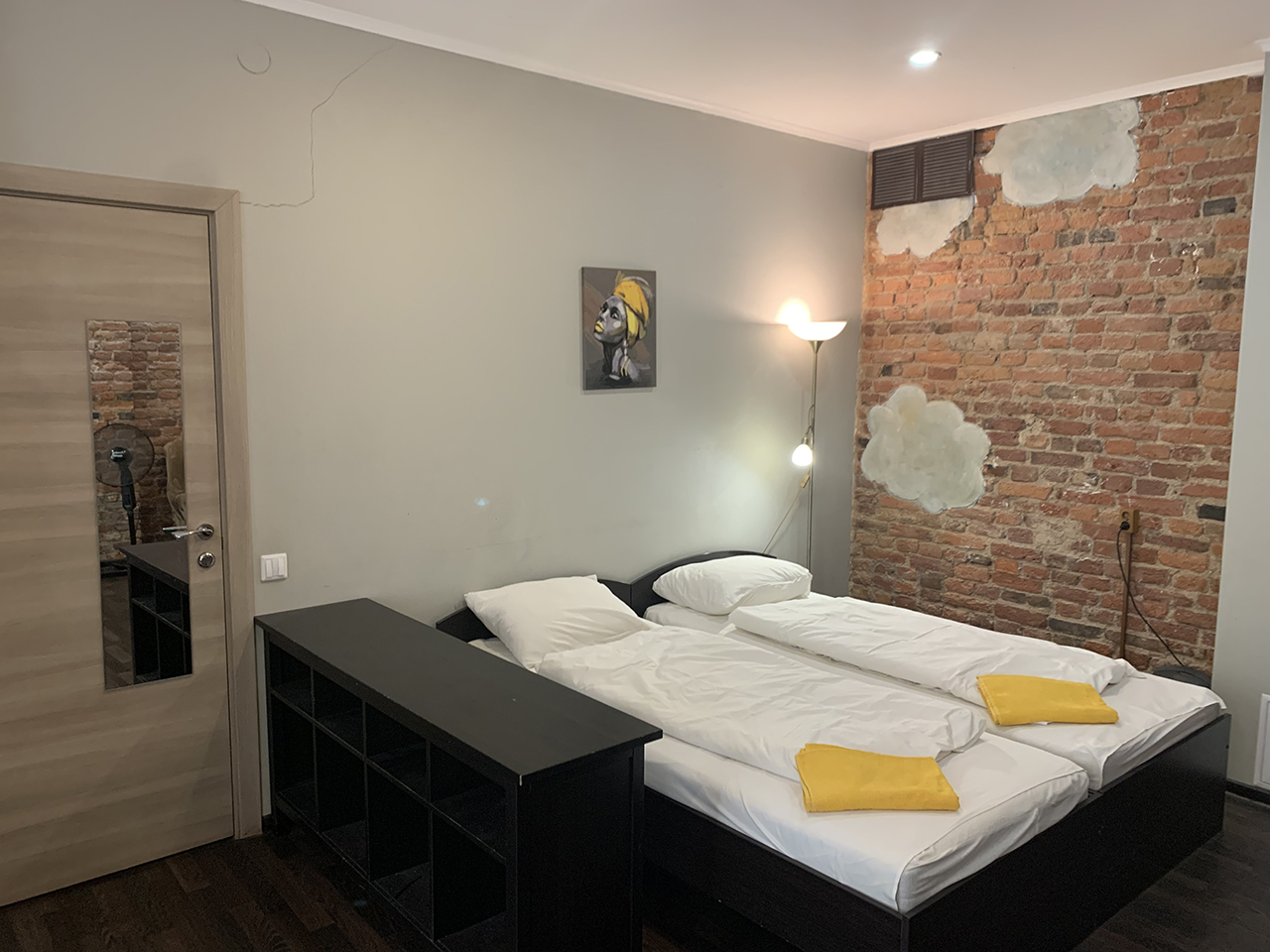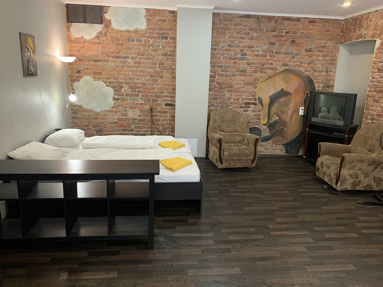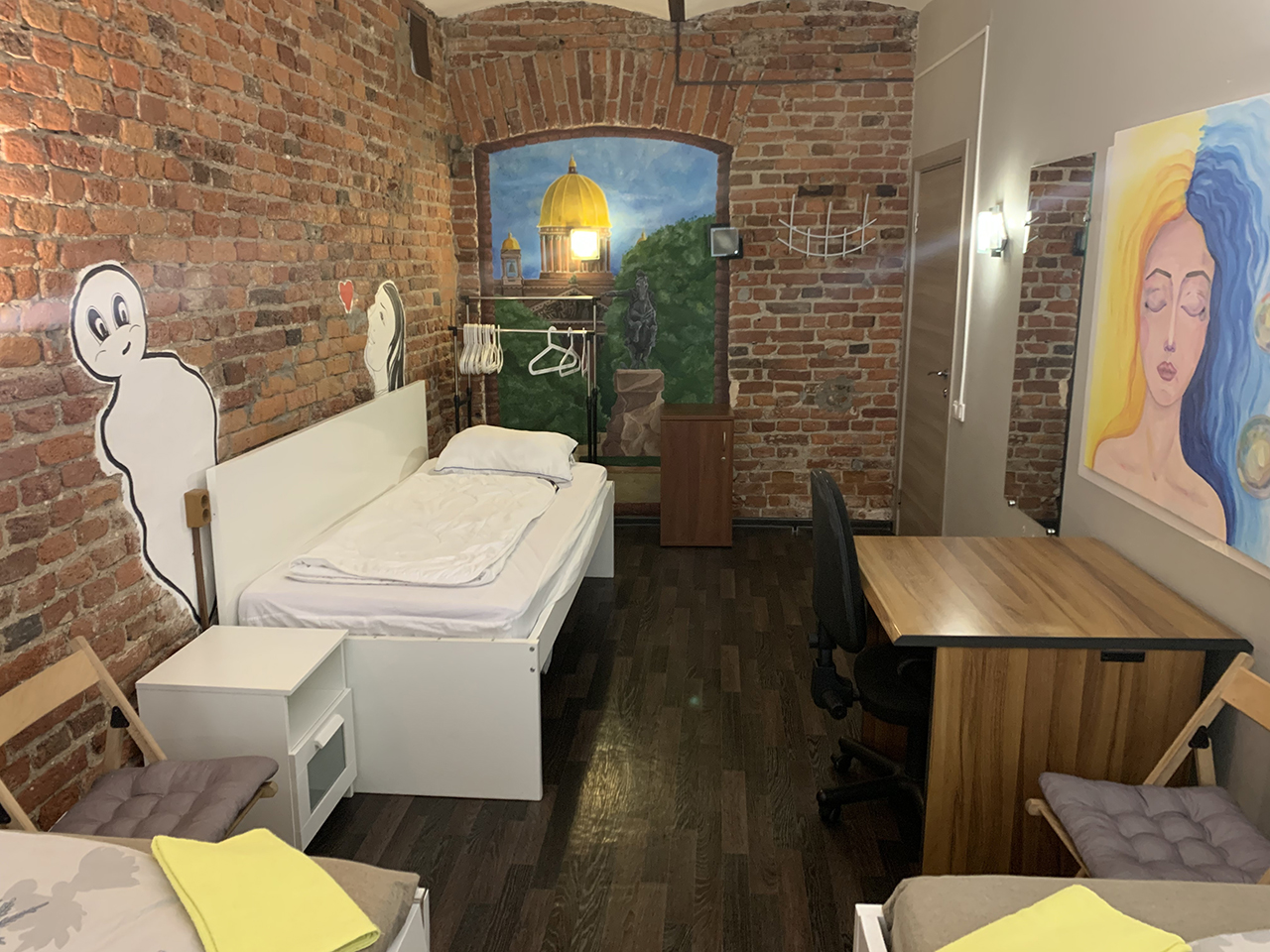 Комната 18 кв м, в стиле "лофт" с тремя односпальными кроватями 90х200. У каждой кровати имеется своя тумбочка и гибкий светильник. Окна на фасад здания. Комнату украшает фреска со стилизованным видом Санкт-Петербурга.