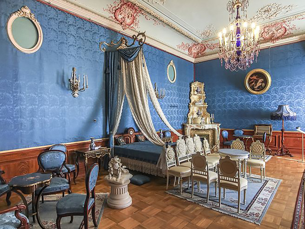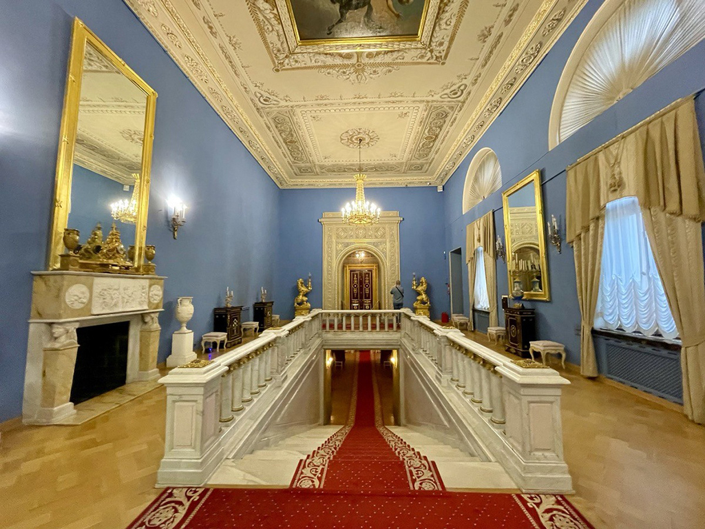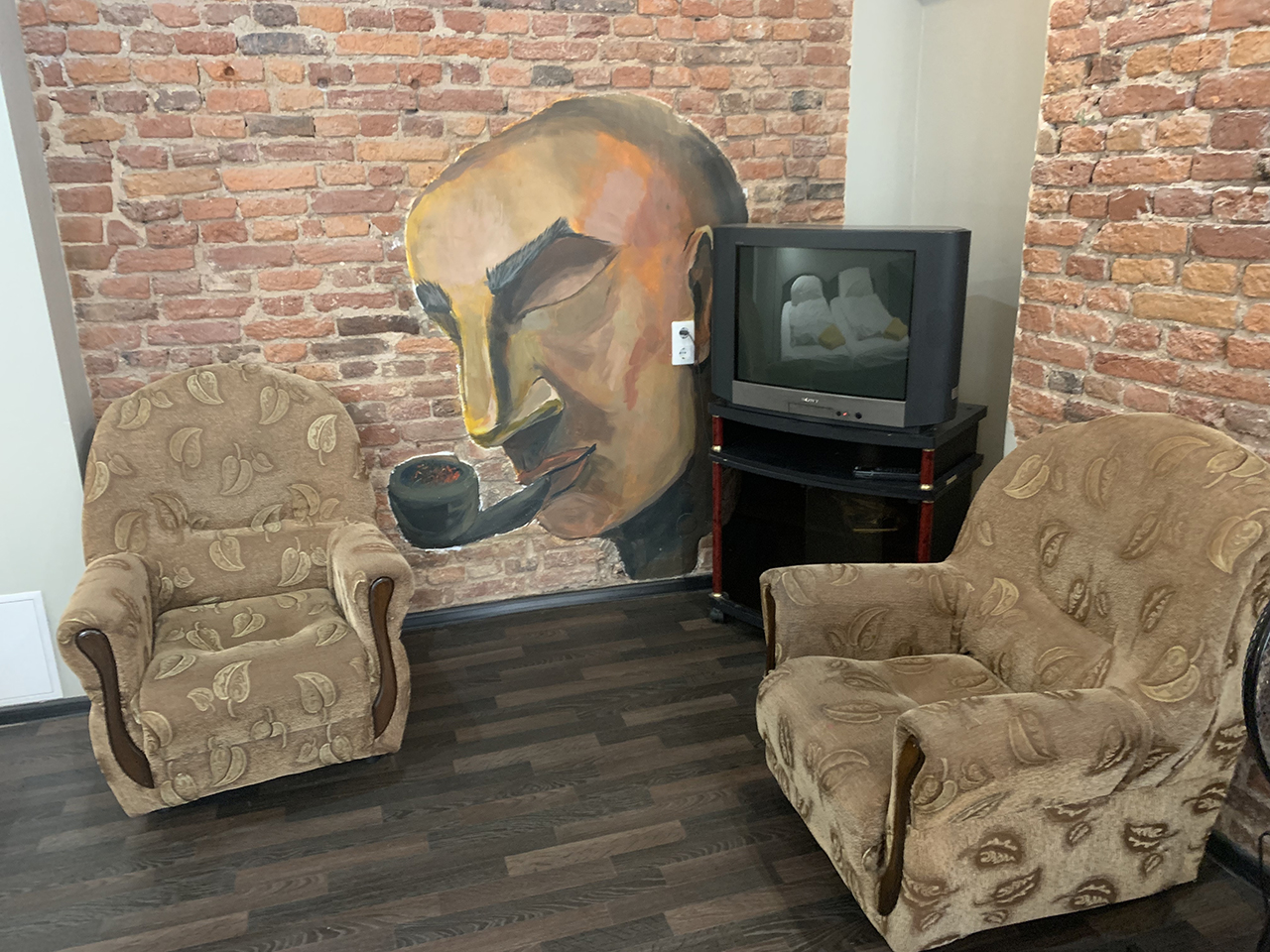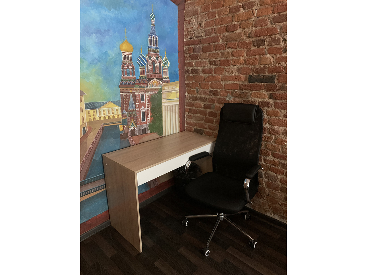 Комнату украшает фреска со стилизованным видом Санкт-Петербурга.